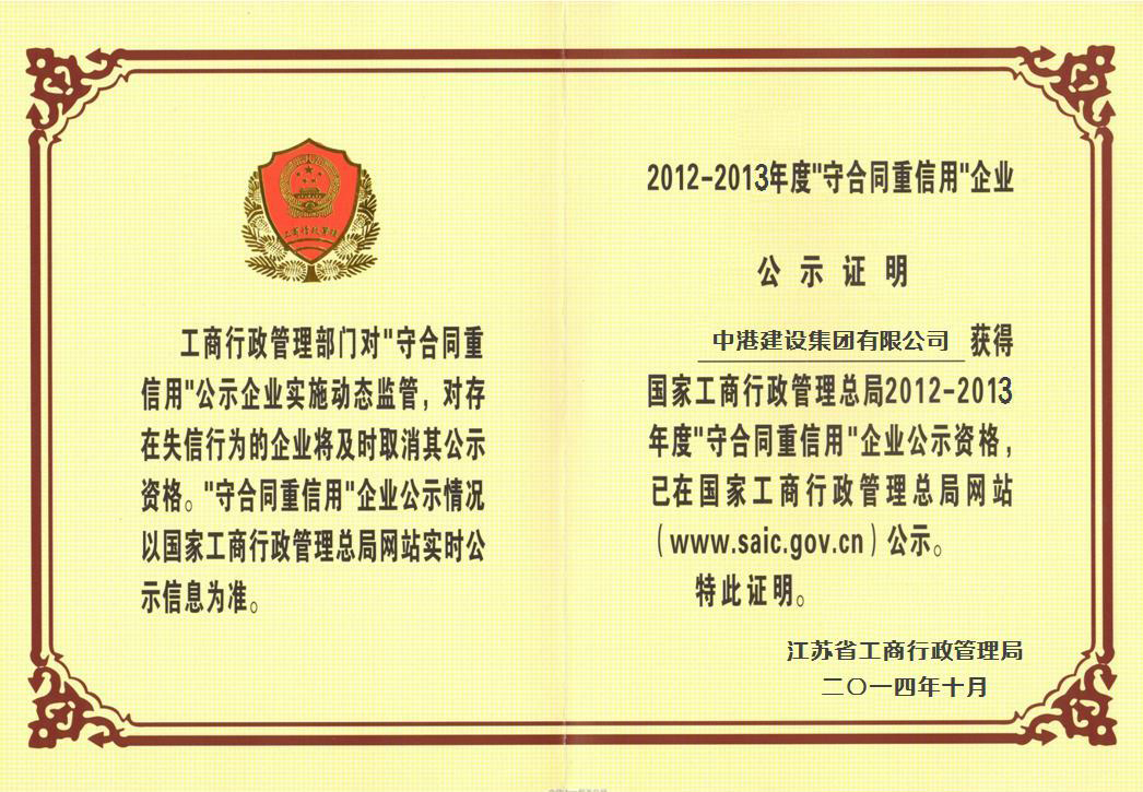 中港建設集團上榜國家工商總局2012~2013年度“守合同重信用”企業名單。據悉,國家工商總局向社會公示企業共計5035家,其中2012~2013年度首次公示的“守合同重信用”企業1850家,已在2010~2011年度公示、申請繼續公示的“守合同重信用”企業3185家。